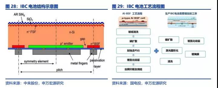 IBC 电池工艺流程为硅片清洗制绒-正反面磷扩散-背面硼扩散-双面钝化层-激光开孔-印刷烧结。由于 IBC 电池背面需要扩散磷和硼,因此其制作过程中需要多次的掩膜和光刻技术以实现定域掺杂,为了防止漏电, P 区和 N 区之间的间隔区域也需非常精准,大幅增加工艺难度。SunPower 是目前全球唯一具备 GW 级 IBC 电池生产规模的企业,预计中环股份投资入股后有望在下游环节形成差异化的竞争优势,通过提升转换效率获得竞争力。