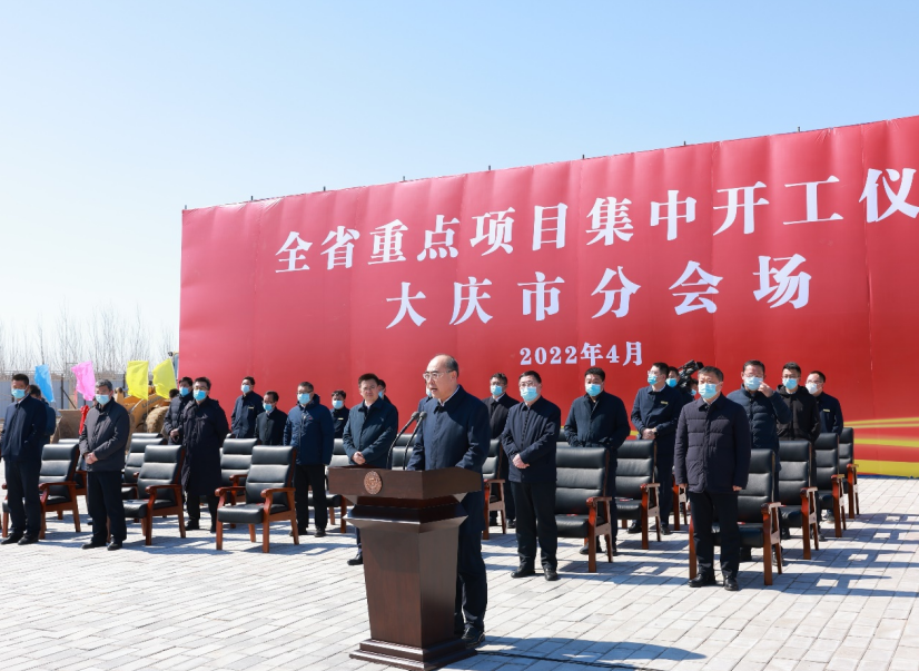 4月7日10时,2022年黑龙江省百大项目集中开工仪式隆重举行,黑龙江省委书记许勤,省委副书记、省长胡昌升发表重要讲话。本次仪式采取1个主会场加12个分会场同步视频的方式召开,其中大庆分会场设在明阳东北风电高端装备制造产业基地项目建设现场。大庆市委副书记、市长李岩松,市委常委、副市长王冰,市委常委、副市长熊敏峰,高新区党工委书记、管委会主任王振涛以及大庆市各区(县)领导和各相关单位负责人出席仪式。