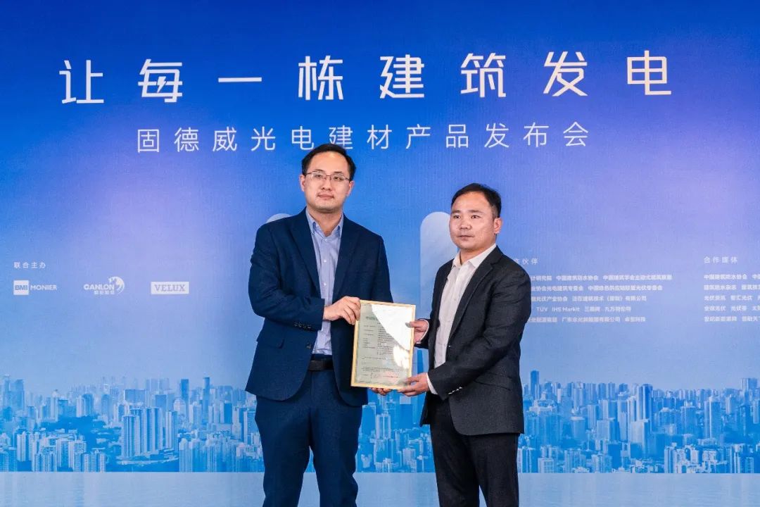 在固德威光电建材产品发布会上,CTC国检集团总经理助理、苏州公司总经理彭超先生,亲临固德威光电建材产品发布会现场,给固德威光电建材事业部颁发了这张充满生机的证书。彭总表达了欣喜:“随着习总书记双碳目标的提出,近两年BIPV迎来了快速发展期,光伏组件建材化,成为建筑构件,代替部分建筑材料使用,成为绿色建材产品的一种特殊形式。固德威在这个领域已经广泛布局并取得了骄人的成绩,我相信,随着像固德威这样的绿色光电建材企业的蓬勃发展,绿色光电建材产品的应用会越来越广泛,让每一栋建筑都能成为光电建筑的愿景终究会实现!”