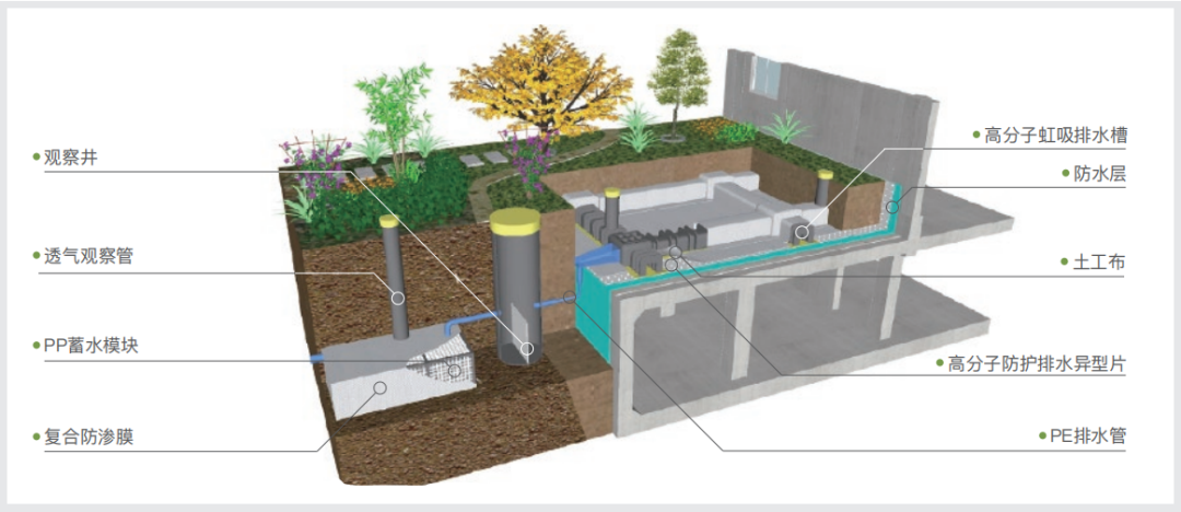 产业园还推出种植顶板海绵城市虹吸排水收集系统,能够将高分子防护排水异型片上多余的水,有组织的通过虹吸排水槽排放至观察井,并可对观察井内的收集水进行二次利用的循环系统。
