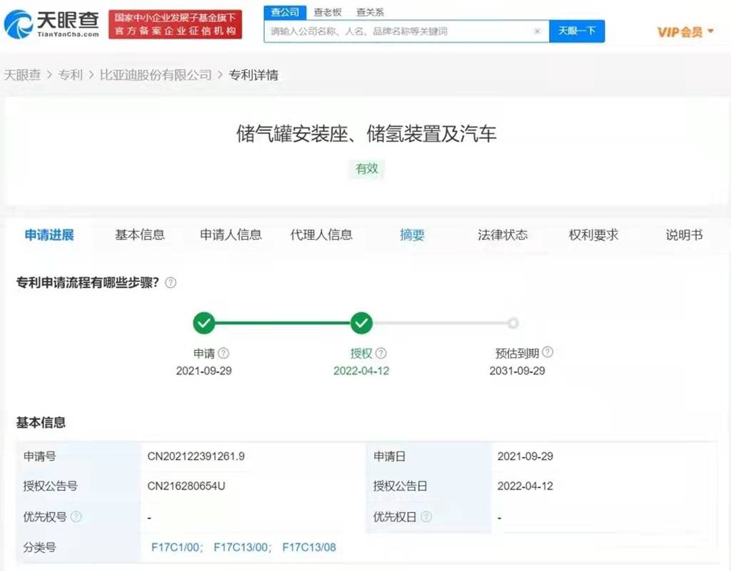 天眼查APP显示,4月12日,比亚迪“储气罐安装座、储氢装置及汽车”专利获授权,授权公告号为CN216280654U。企查查专利摘要显示,本实用新型属于燃料电池汽车技术领域,涉及一种储气罐安装座、储氢装置及汽车,储气罐安装座,其中储气罐安装座采用推拉式装卸储气罐,拆卸更换快捷方便。