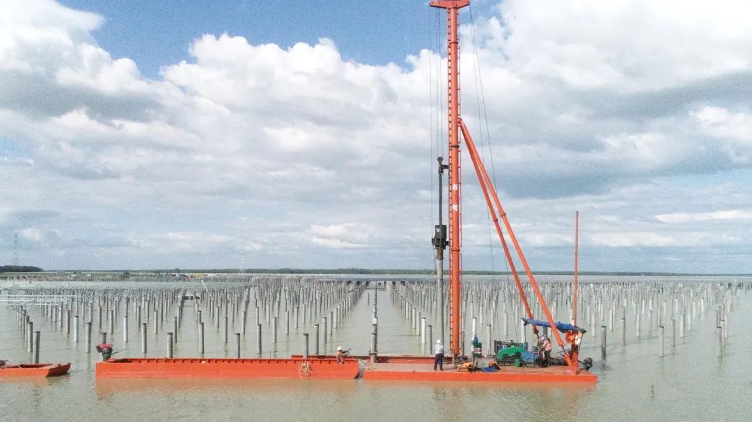 面对场区水中施工的困难条件,项目团队创新采用多种施工设备、施工工法,高效推进工程进度。首次提出水位变幅条件下光伏场区高效建造关键技术;在水面环境下首次采用大规模超高效异质结组件关键技术;首次提出半浸没环境下场区检修道路施工关键技术,破解项目建设难题。