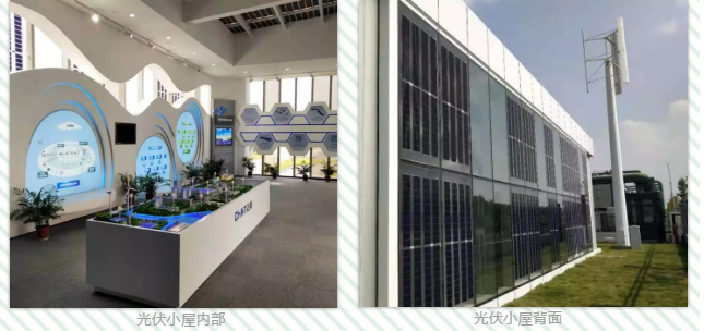 光伏小屋集绿色建筑、科普、休闲、参观、展览、产能功能于一体,在130余平方米的光伏小屋屋顶、南立面幕墙及西立面幕墙安装光伏BIPV组件,将光能转换成电能,通过组串式逆变器接入电网;同时,小屋内集成应用了空气源热泵、建筑隔热膜等节能舒适产品。