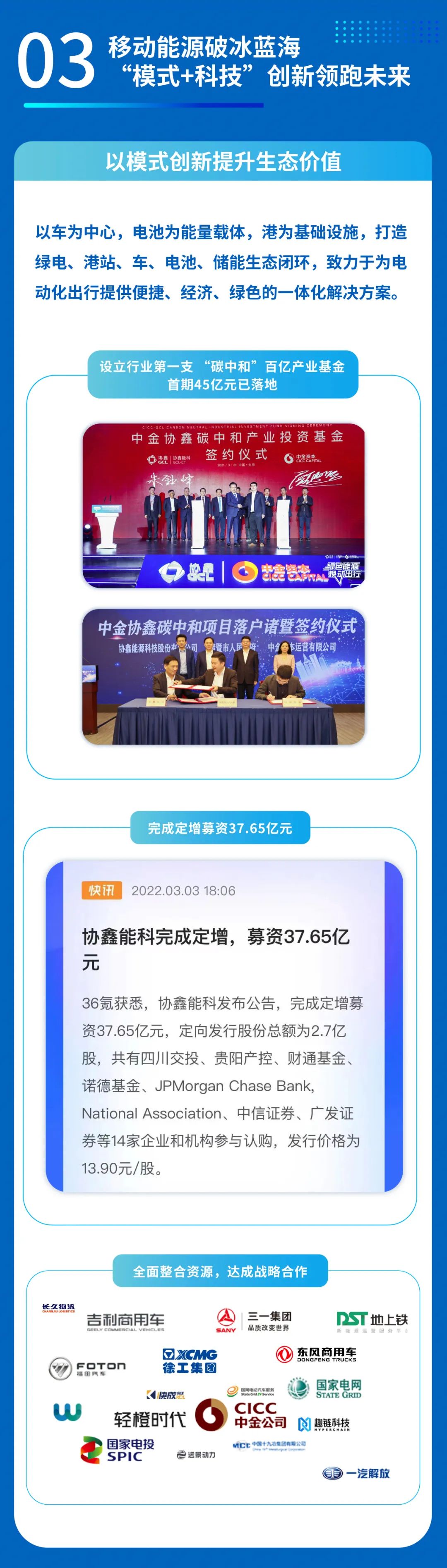 与此同时,协鑫能科发挥清洁能源、储能与补能生态的协同优势,迅速布局移动能源业务,全面整合汽车生产、电池制造、出行平台、物流企业等行业以及政府资源,构筑便捷、经济、绿色出行新生态;持续加大科研投入,打造核心换电产品,掌握多项自主研发的核心技术。今年3月公司接连公告完成定增募资37.65亿元,中金协鑫碳中和百亿产业投资基金首期不超过45亿元正式落地,自有资金实力增强,逐步奠定并巩固行业领先地位。