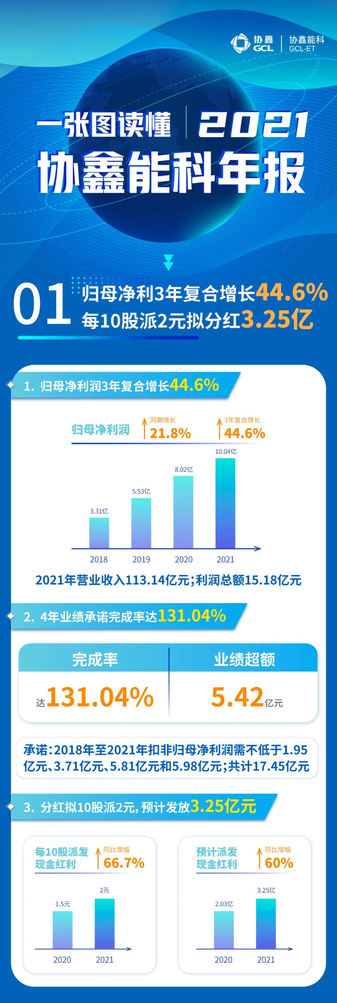 2022年4月14日晚间协鑫能科发布2021年年报称, 2021年实现营业收入113.14亿元;利润总额15.18亿元;归属于上市公司股东的净利润10.04亿元,较上年同期增长21.8%, 2019年至2021年连续3年复合增长率达44.6%。拟向全体股东每10股派发现金红利2.00元(含税),共计3.25亿元。