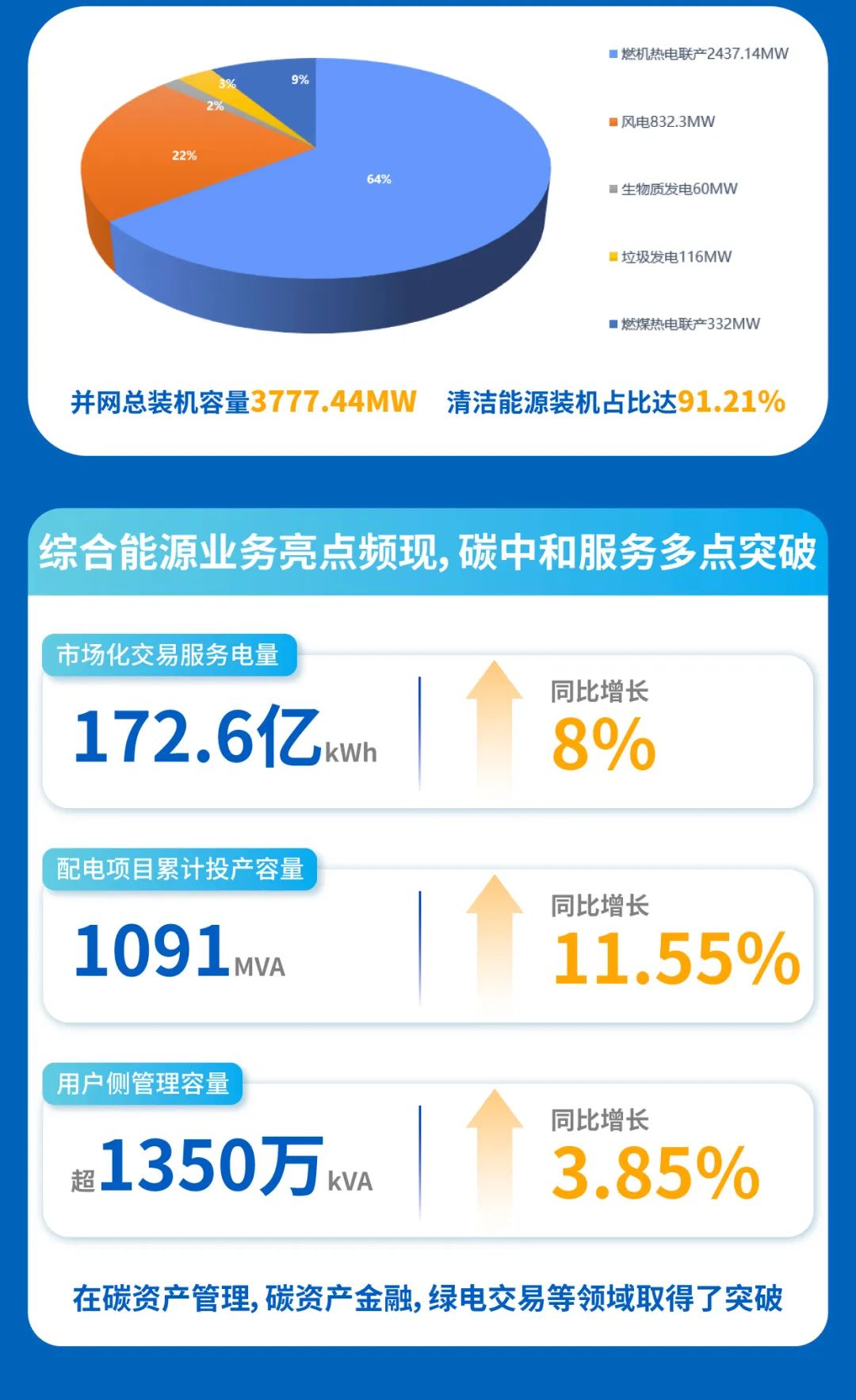 作为国内领先的移动数字能源科技运营商,公司绿色能源运营主业继续保持良好增长势头。截至2021年底,公司并网总装机容量为3777.44MW,以天然气热电联产、风电为主的清洁能源装机占比达91.21%。其中,风电并网装机容量快速提升至832.3MW,同比增长58.7%。此外在售电、配电、用户侧管理等综合能源服务领域也都取得增长。