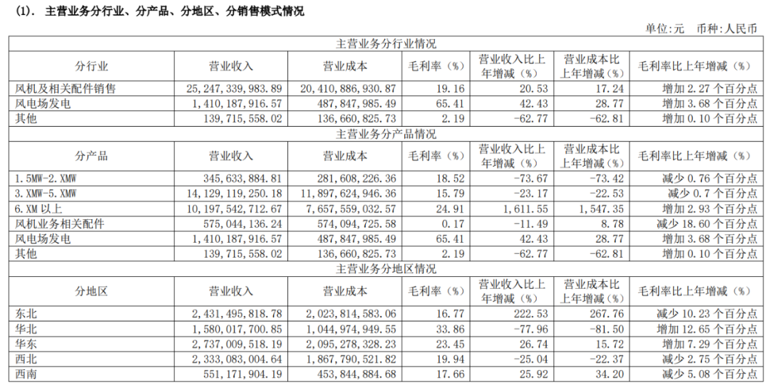 报告期内,公司实现风电机组对外销售6.03GW,同比增长6.5%;对应实现风电机组及相关配件销售252.47亿元,同比增长20.53%;风电机组及相关配件销售毛利率19.16%,同比上升2.27个百分点。报告期内,公司风电机组新增订单达到11.22GW,同比增长160%,是公司有史以来新增订单量最大的一年。