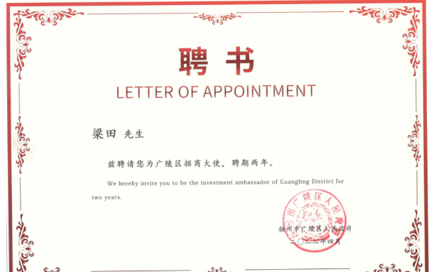 海纳百川!宝利鑫董事长梁田受聘为扬州广陵区招商大使