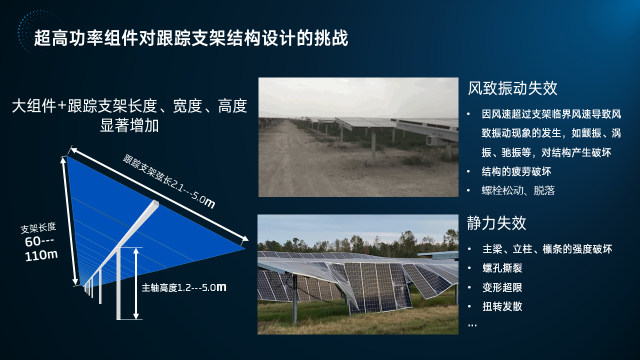 对于以上一至四项,可以总结为大组件应用下更容易因为风致破坏(静态破坏和动态破坏)导致跟踪支架结构失效。跟踪支架企业需要从更优的设计、更严苛的测试标准、大组件与跟踪支架的匹配度测试等方面进行改进,加强跟踪支架的可靠性。如何破局?全总在会上分享了天合跟踪的研发经验。
