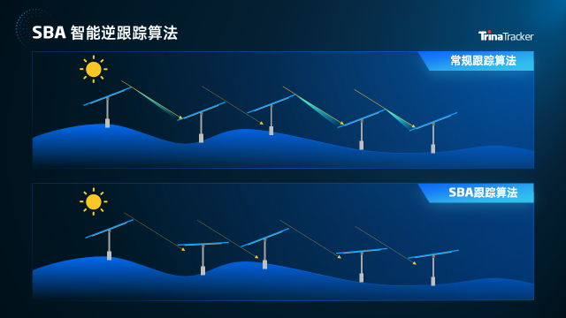 SBA在复杂地势,比如带有坡度的场景下提高发电量非常明显。在坡度的地形下,常规逆跟踪无法实现理想的效果,而SBA通过微遮挡逆跟踪模型,独立控制每一排支架,来减少遮挡和漏光现象,从而提高坡地光伏的发电量。