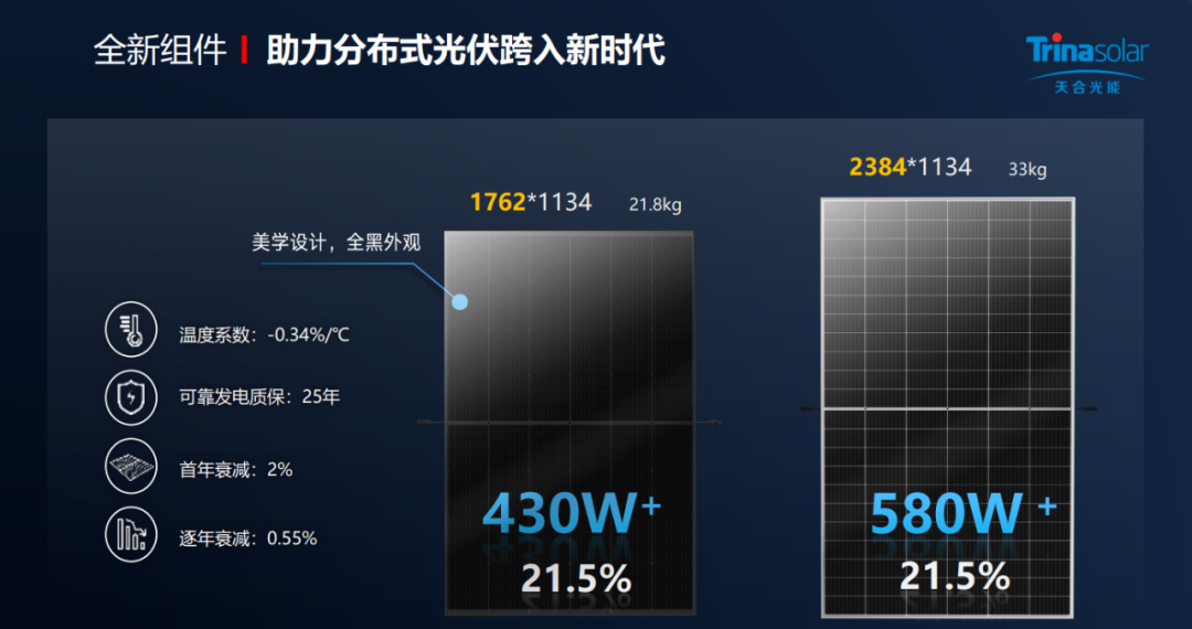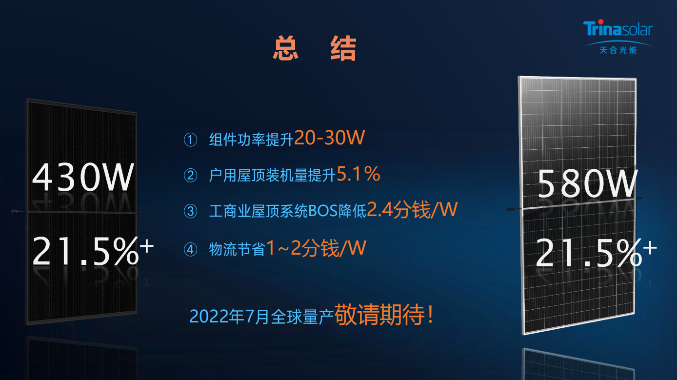 最为引人瞩目的事,在此次发布的新品中天合光能首次应用了新的硅片尺寸(210*182),据介绍,通过创新的210矩形硅片(G12R)电池技术及组件极致设计,显著提升组件效率及功率,相较市面同类组件尺寸和功率范围的产品,至尊小金刚430W和至尊580W产品分别有20-30W的功率优势。