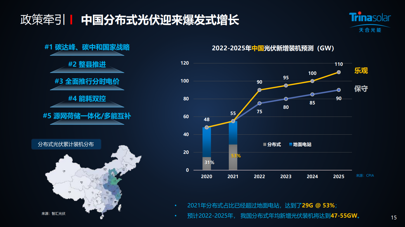 张映斌:我们看到当前无论是全球还是中国的分布式市场都在快速增长,在全球市场分布式占比已近48%,而在中国去年分布式比例已达53%,分布式已经成为光伏发电领域最重要的组成部分。但由于历史原因,以往分布式市场的产品并不受重视,大部分情况是将低功率或尾货产品用于分布式市场,而随着分布式占比进一步扩大,我们需要为分布式市场提供更高价值、更高效率、更高功率的产品,从而实现这些细分市场客户的价值最大化。