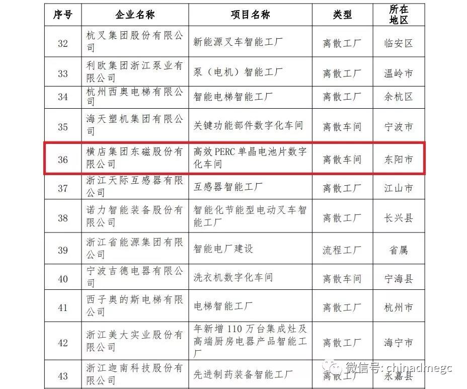 11月19日,浙江省经信厅公布2019年浙江省数字化车间/智能工厂名单,横店集团东磁股份有限公司“高效PERC单晶电池片数字化车间”榜上有名。