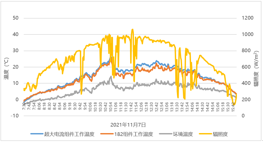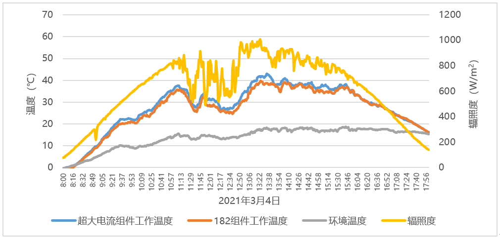 图4 海南实证项目182组件和超大电流组件工作温度对比数据