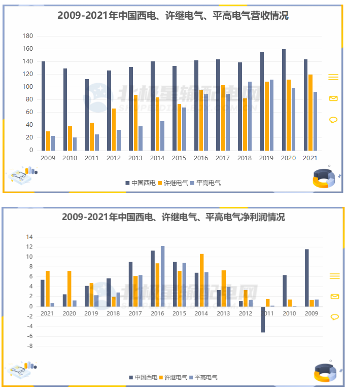 2021年,中国西电、许继电气、平高电气营收情况分别是143.9亿、119.9亿、92.73亿;净利润情况5.44亿、7.24亿、7077万。