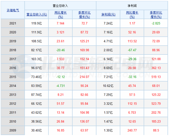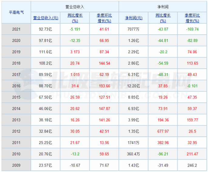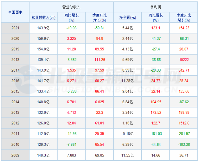 2009-2021年度,中国西电、许继电气、平高电气业绩情况