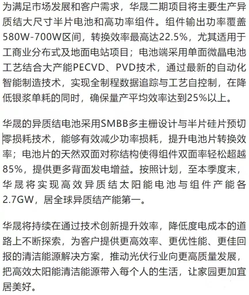 4月25日,华晟二期2GW高效异质结项目首片组件顺利下线。