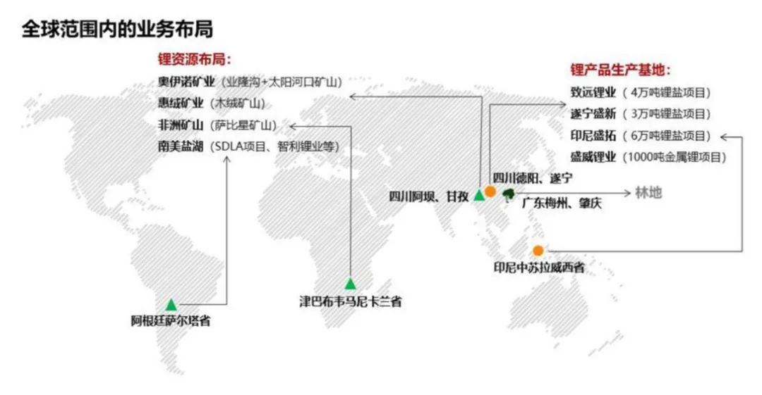盛新锂能是知名的锂资源开发企业,主要产品涵盖锂精矿、碳酸锂、氢氧化锂、氯化锂、金属锂,其具有多个锂产品生产基地,并在全球范围内布局多个锂资源项目,在硬岩矿山方面,盛新锂能及其子公司拥有业隆沟锂辉石矿采矿权和太阳河口锂多金属矿详查探矿权、津巴布韦萨比星锂钽矿总计40个稀有金属矿块采矿权证、雅江惠绒矿业25.19%股权,惠绒矿业拥有1项探矿权;在盐湖资源方面,盛新锂能收购了阿根廷SESA公司100%股权,拥有阿根廷SDLA盐湖项目的运营权,并通过参股参与到阿根廷多个盐湖初期勘探项目。