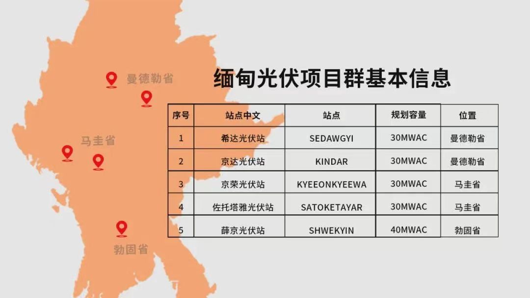 缅甸中部光伏项目群规划交流容量 160MWac,直流装机容量约192MWp,分五个子项目同批建设,分别是希达30MW光伏电站、京达30MW光伏电站、京荣30M光伏电站、佐托塔雅30MW光伏电站和薛京40MW光伏电站。项目群位于缅甸伊洛瓦底江平原曼德勒——内比都——仰光一线,分布于曼德勒、马圭与勃固三省境内,是缅甸境内光照资源最丰沛、产业最集中、基础设施最完善的区域。项目建成后将直接并入缅甸国家电网,极大改善当地和缅甸境内电力紧缺的现状,对当地经济发展具有重要的促进作用。