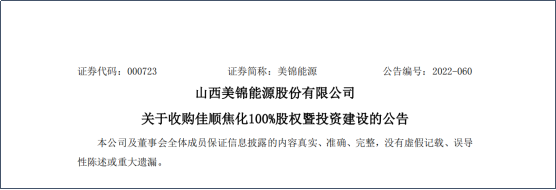 5月17日,山西美锦能源股份有限公司(下称:美锦能源)发布了《关于收购佳顺焦化100%股权暨投资建设》的公告。