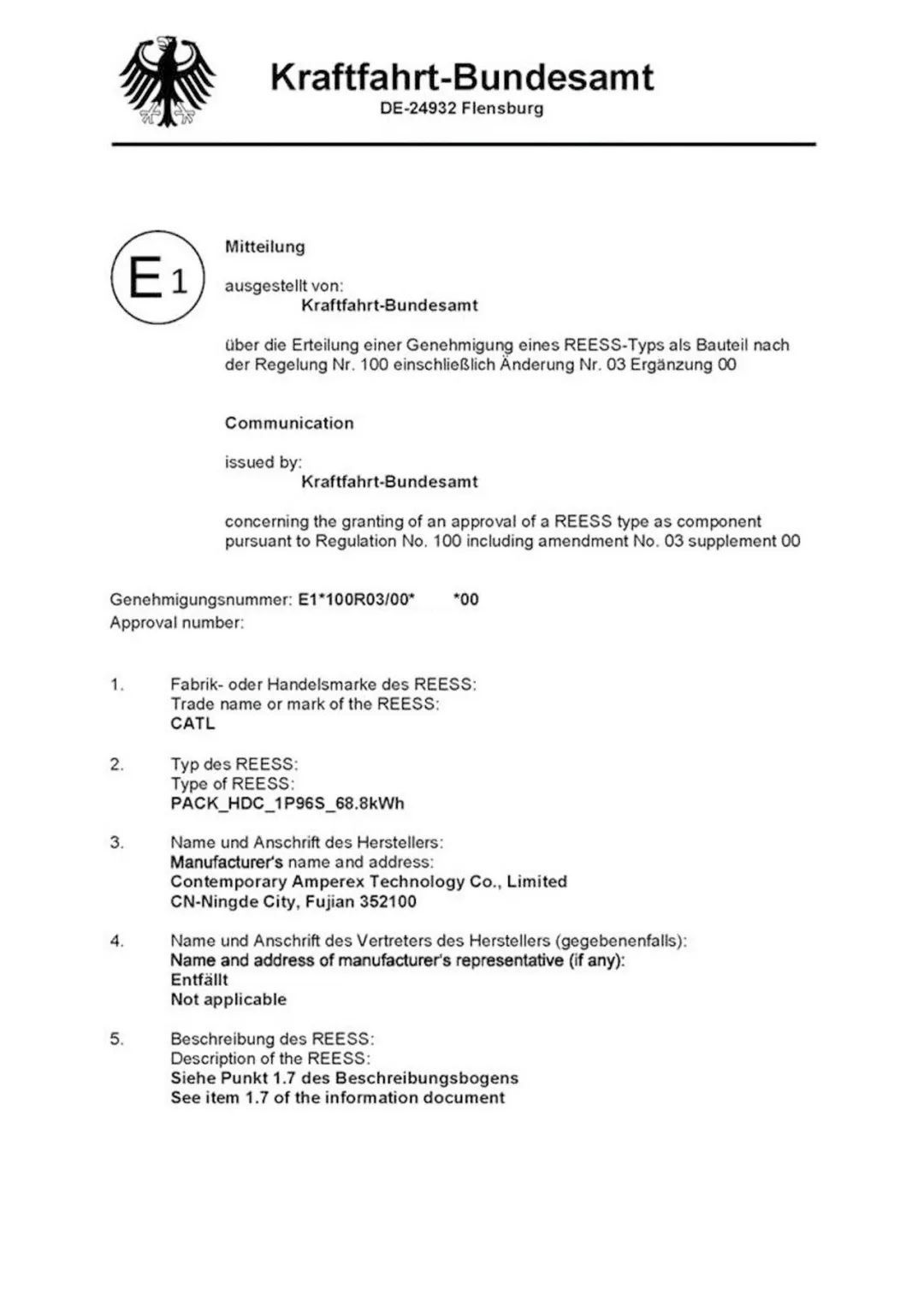 近日,宁德时代获得德国交通部颁发的全球首张欧洲经济委员会R100.03动力电池系统证书。