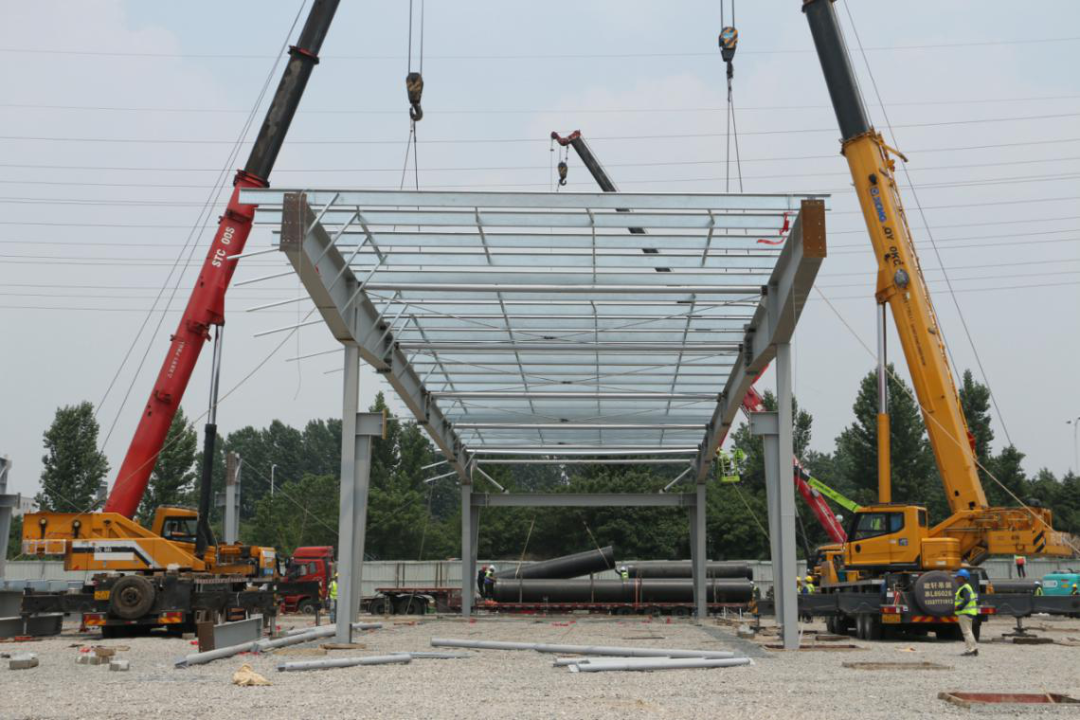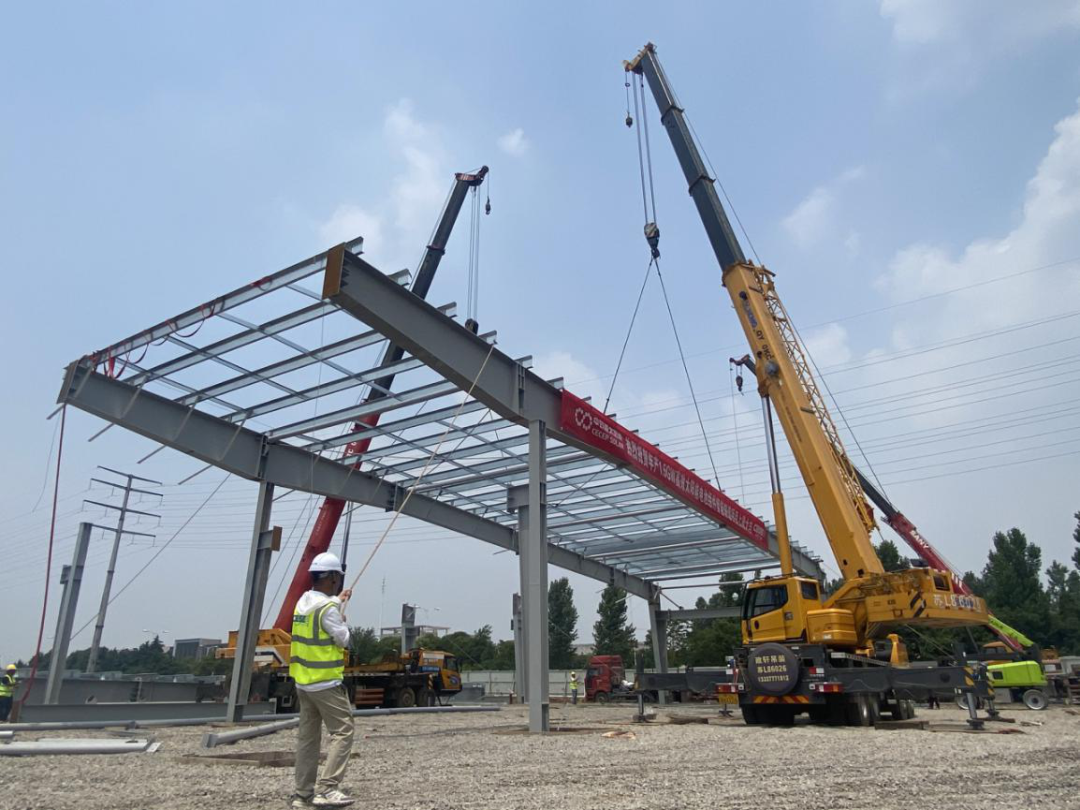 项目施工现场,数台大型机械来回作业,工人师傅们为了不误工期,加班加点,抢抓天时,争取在梅雨季节到来前,完成钢结构安装工作。项目的主结构吊装完成后,屋面板、墙面板、门窗安装等后续工作也将迅速开始。镇江公司工程部全体同事与施工单位人员将全力以赴,保质保量完成1.5GW高效组件智能制造工程项目的建设。