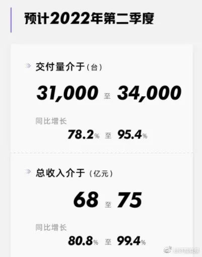 对于2022年第二季度,小鹏汽车预期交付量将介于3.1万-3.4万辆,同比增长约78.2%-95.4%;总收入将介于68亿-75亿元,同比增长约80.8%-99.4%。