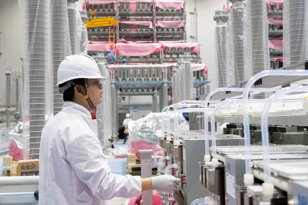 ▲工程建设人员对换流阀设备进行检查。陈振良 摄