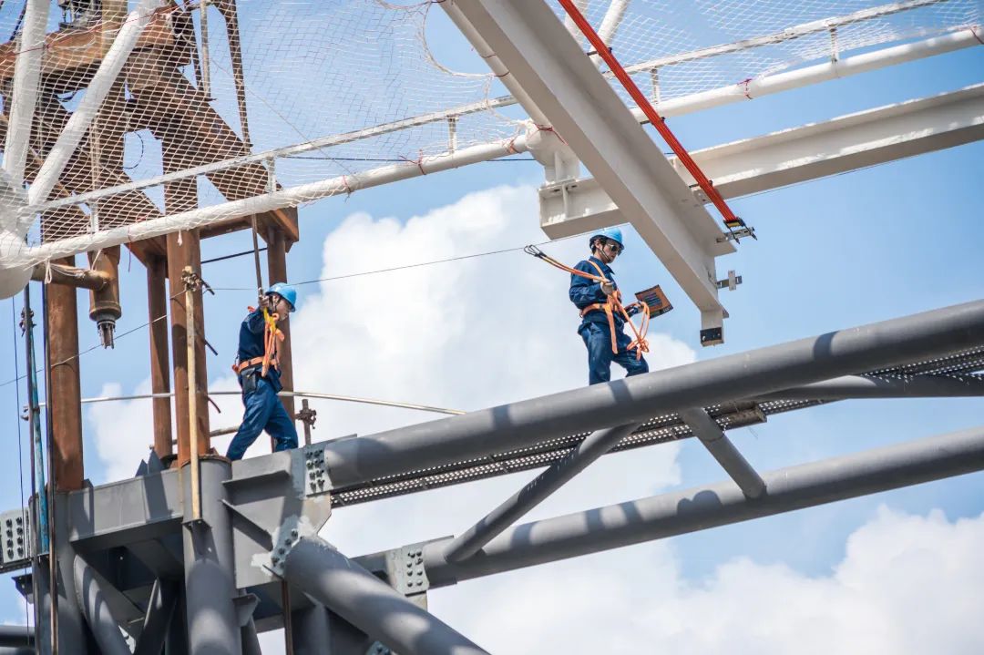 ▲施工人员对东莞工程阀厅网架提升平台和提升器进行检查。顾萱 摄