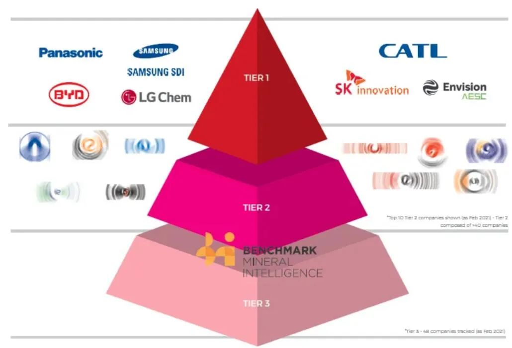 英国研究机构Benchmark发布了2021年全球汽车电池供应商评级报告,宁德时代、远景动力(Envision AESC)位列第一梯队供应商