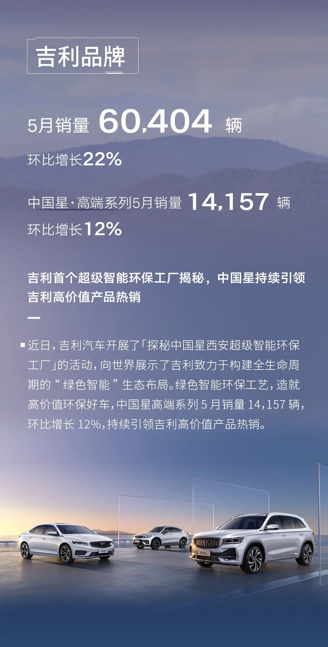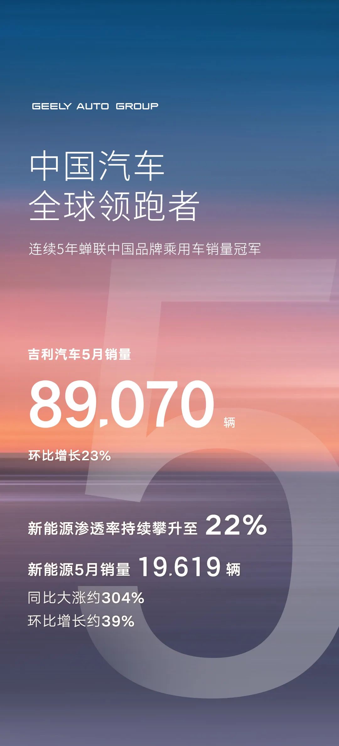 新能源销量同比大涨304%!吉利汽车5月销量达89070辆
