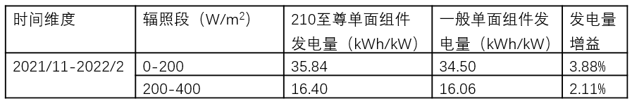 首先,下表是测试期间辐照小于400W/㎡时两种组件单瓦发电量的差异。可见辐照低于200W/㎡时,210至尊组件发电量较一般参考组件高出3.88%;在200-400W/㎡辐照下,发电量增益达2.11%,所以,天合210至尊组件在低辐照下的单瓦发电量有显著优势。