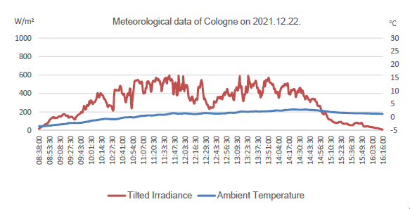 其次,根据测试期间气象数据表,可以看出,测试期间德国科隆正处于冬季,其辐照度和气温水平都处于较低水平。回顾其整体辐照情况,水平面日累计辐照量大约只有0.4kWh/㎡/天。