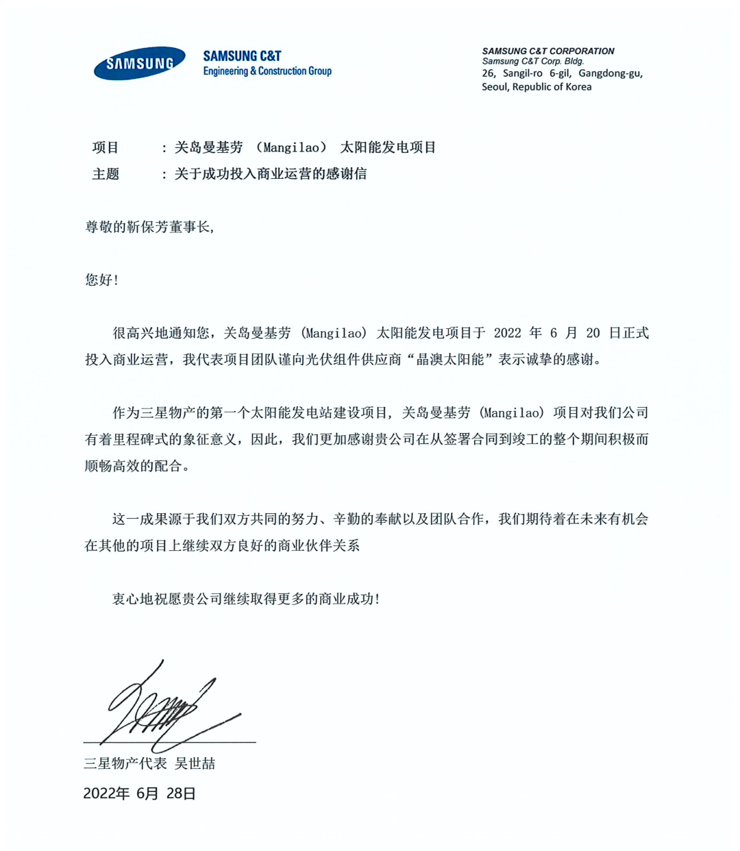 晶澳助力关岛曼基劳88MW项目顺利并网 三星物产致感谢函