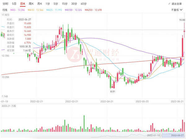 6月27日,洛阳玻璃股份(01108,SH:600876)延续近段时间来的强势走势,截至收盘H股报15.82港元,涨幅6.75%。6月23日、24日、27日三个交易日,洛阳玻璃股份H股累计涨幅接近四成。