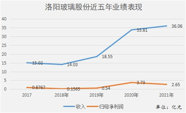 业绩方面,以2017-2021年五年时间维度来看,洛阳玻璃股份的收入分别为15.02亿元、14.03亿元、18.55亿元、33.81亿元、36.06亿元,整体呈高速增长态势,但至2021年增速已显著趋缓。