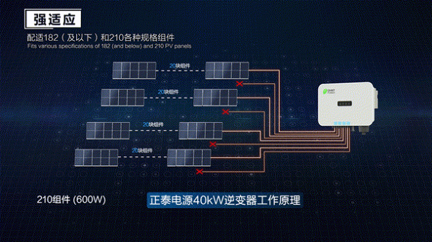 10-60kW户用逆变器具有强大的组件适应能力,高超配比,可适配210、182及以下各种规格组件。MPPT电流最大可达15A,完美兼容600W+高功率组件,满足不同用户使用需求。MPPT转换率突破99.5%,发电效率最大效率可达98.5%,大幅提升发电效率、降低损耗。以40kW逆变器为例,针对不同组件有相应的适配方案:针对166/182组件,每路MPPT可接入2路输入;针对210组件,采用二合一应用,每路MPPT只接1路输入。