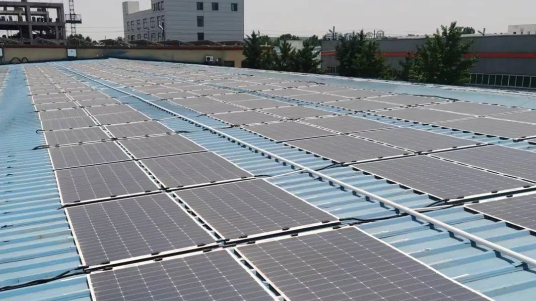 在河南鹤壁,某一工厂的彩钢瓦屋顶上铺排着日托轻柔组件,该项目展示出一个工商业分布式光伏的典型范例,为企业绿色发展贡献一份光伏力量。
