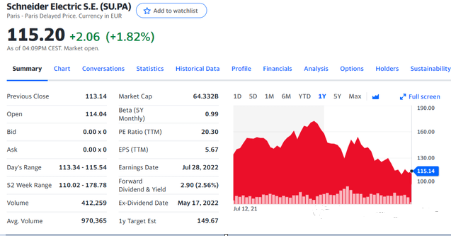 尽管施耐德在中国的 2022 年第二季度将疲软,但基本面和强劲的执行力继续支持该集团的经营业绩。该公司目前的交易价格为 16 倍的市盈率和 13.1 倍的 EV/EBITA ,鉴于施耐德提供的增长质量,我们认为这非常引人注目。伊顿公司和罗克韦尔自动化的平均市盈率为 22 倍,EV/EBITDA 为 15.8 倍。这代表了度施耐德电气不合理的重大折扣。Seeking Alpha对施耐德电气的估值与其同行一致,得出的目标价为每股 165 欧元。