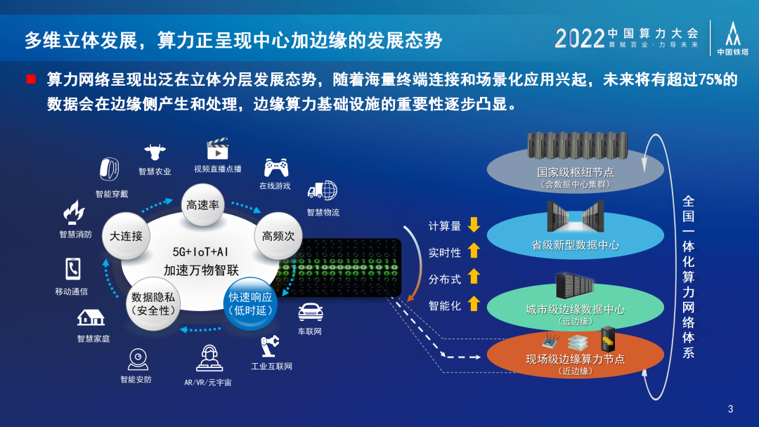 张志勇指出,当前,产业数字化、数字产业化持续深入推进,5G、物联网、AI等技术使得终端连接规模和数据量迅速增长,计算需求呈指数态增长,因此算力基础设施建设也迎来了加速期。随着我国“东数西算”工程启动,全国算力网络呈现出泛在立体分层、中心与边缘同步发展的态势。随着海量终端连接和场景化应用的兴起,未来将有超过75%的数据会在边缘侧产生和处理,边缘算力基础设施的重要性逐步凸显。