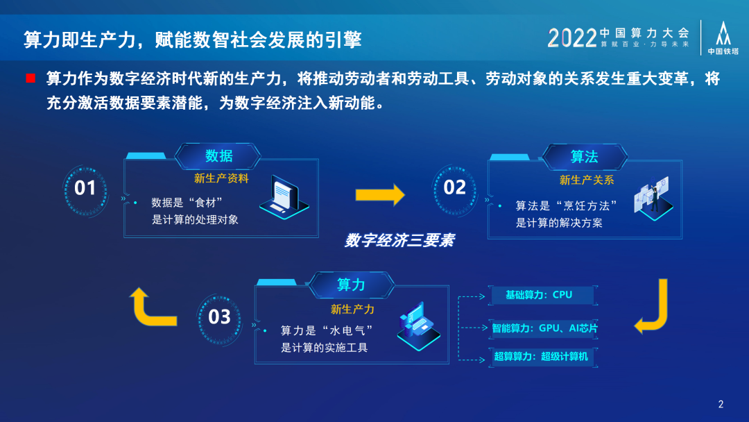 习近平总书记指出:“数字经济代表未来发展方向,数字经济发展速度之快、辐射范围之广、影响程度之深前所未有,正在成为重组全球要素资源、重塑全球经济结构、改变全球竞争格局的关键力量。”对于数字经济而言,数据、算法和算力共同构成了三大要素,数据是生产资料、算法是生产关系,算力是新的生产力,将促使劳动者、劳动工具和劳动对象的关系发生重大变化。构筑新型算力基础设施,是推动数字经济发展的重要前提和重大举措。