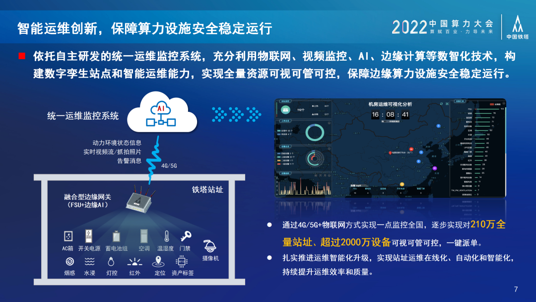 边缘基础设施往往是点多面广、网格化分布的,如何实现这些设施的可视可管可控,是个重要课题。中国铁塔在这方面也积累了很多经验,形成了专业化、智能化的运维能力。中国铁塔按照“能自动不人工、能远程不现场”的原则,依托统一的运维监控系统,充分利用物联网、视频监控、AI、边缘计算等数智化技术,构建数字孪生站点和智能运维能力,逐步实现对210万站址、超过2000万设备的可视可管可控,打造最大的5G行业应用;一旦发现故障,监控系统主动报警、自动派单,实现资产“少人、无人维护”。这种数字化、智能化的运行维护能力,将为算力基础设施的运行维护保驾护航,确保安全稳定运行。