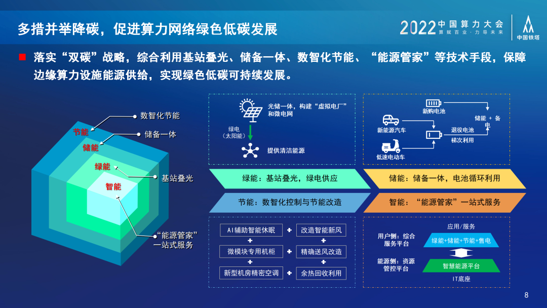 张志勇强调,在“碳达峰、碳中和”目标的指引下,如何实现算力和能耗的双赢,也是算力基础设施建设运营的重要课题之一。近年来,中国铁塔基于分布式的基站供电网络和由350万组蓄电池组成分布式储能系统,为客户提供电力保障综合解决方案和综合能源服务。面向算力网络建设发展,我们将综合利用基站叠光、储备一体、数智化节能、“能源管家”等技术手段,加大对边缘算力设施的能源供给和保障,通过节能、储能、绿能、智能,推动边缘算力设施低碳绿色发展。