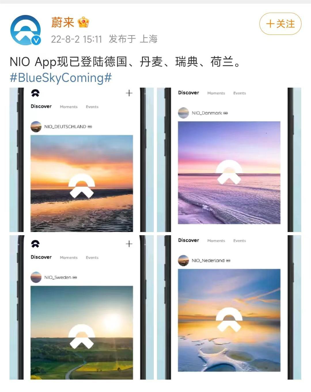 此外,蔚来宣布旗下 NIO App 已登陆德国、丹麦、瑞典、荷兰。