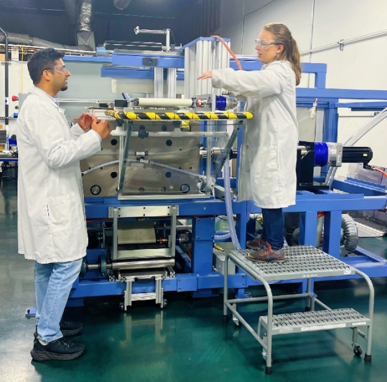 工程师们正在对新一代活化干法电池电极(ADBE)设备进行调试