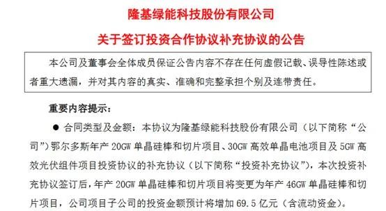 隆基绿能14日晚间公告,根据公司未来产能布局和规划情况,公司于2022年8月14日与鄂尔多斯市人民政府、伊金霍洛旗人民政府签署了《投资合作协议补充协议》,将原协议中约定的年产20GW单晶硅棒和切片项目变更为年产46GW单晶硅棒和切片项目,30GW高效单晶电池项目及5GW高效光伏组件项目产能维持不变。公司项目子公司的投资金额预计将增加69.5亿元(含流动资金)。