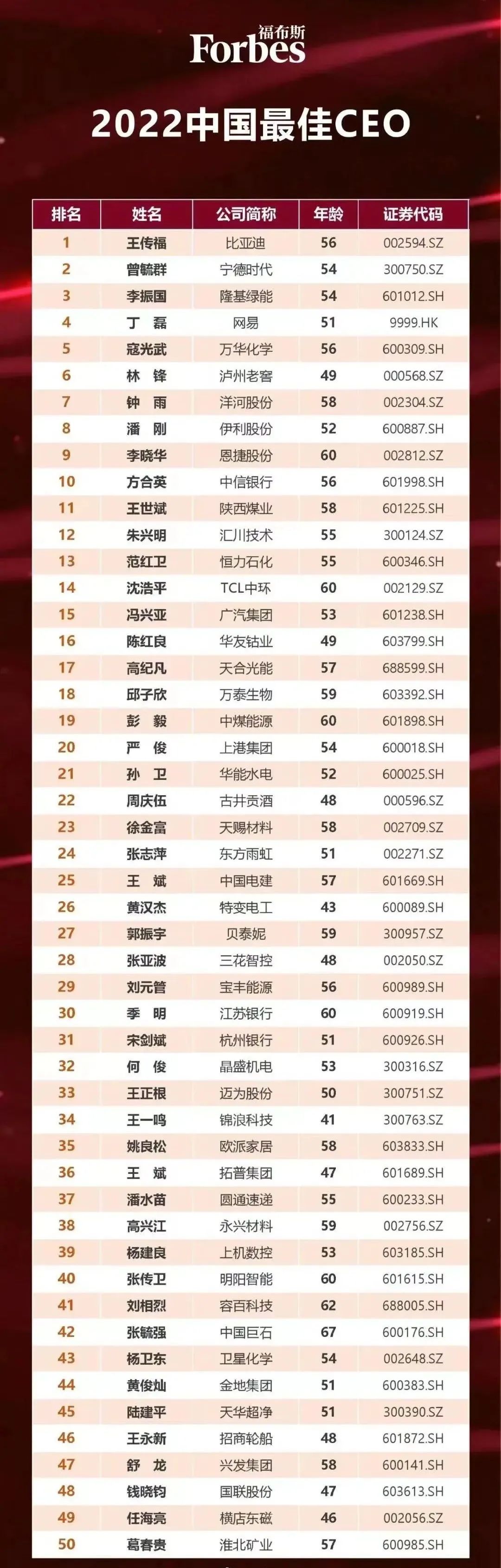 该榜单制作主要参考上市公司市值、区间股价涨跌幅、净利润及增长率、ROE等基础财务指标,通过对包括A股、港交所上市中资港股及境外上市中概股在内上千家上市公司的比较研究,挑选出综合得分排名前50位的上市公司CEO。需要注意的是,为排除一些CEO以牺牲公司长期发展为代价,追逐短期财务指标,福布斯中国对最佳CEO的考察为其所在公司连续三年的经营业绩,而非短期内公司在资本市场中的表现,CEO的任期需跨该三个财务年度。