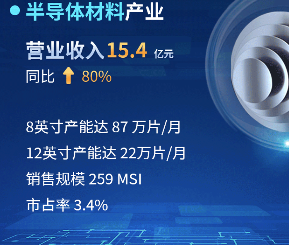 半导体材料业务板块:公司的抛光片及外延片产品出货面积同比增长 76.2%,其中 8-12 英寸同比增长 107%。在产销规模和产品结构方面,2022 年公司抛光片、外延片产品出货量大幅提升,产 品结构优化升级,在新能源、汽车电子、物联网等应用领域保持快速增长。截至报告期末 已经形成 6 英寸 60 万片/月,8 英寸 87 万片/月、12 英寸 22 万片/月产能。