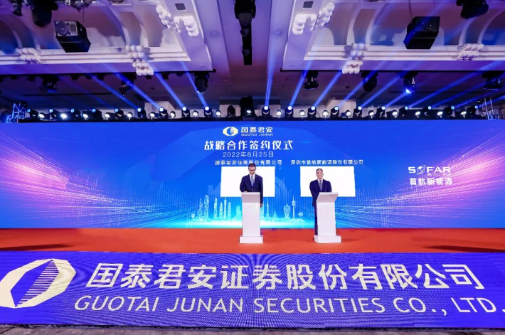 8月25日,首航新能源与国泰君安证券股份有限公司在深圳正式签署战略合作协议,国泰君安证券股份有限公司党委书记、董事长贺青,国泰君安证券股份有限公司总裁王松,副总裁、投行事业部总裁、党委组织部部长、人力资源总监李俊杰与汇川朱兴明,首航新能源董事长许韬,首航新能源企业负责人印荣方等领导出席协议签署仪式。