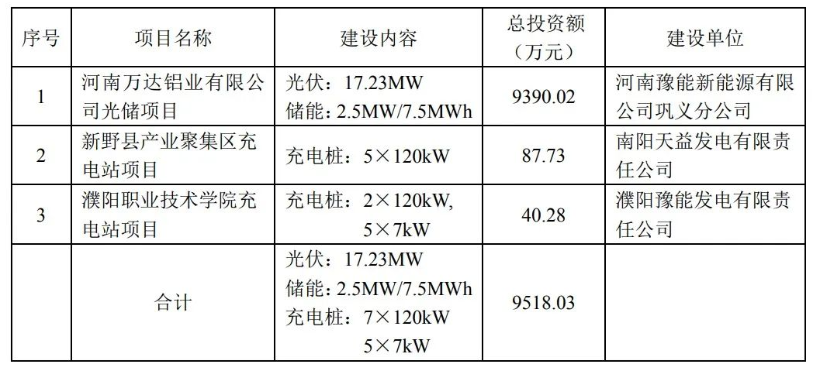 公司子公司河南豫能新能源有限公司拟对外投 资建设河南万达铝业有限公司光储项目,并在河南省巩义市成立豫能新能源巩义分公司,总建设规模光伏17.23MW,储能 2.5MW/7.5MWh,总投资额 9390.02 万元。